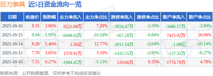 证券之星消息,截至2025年10月16日收盘,巨力索具(002342)报收于8.35元,上涨3.86%,换手率11.4%,成交量108.81万手,成交额8.96亿元。
