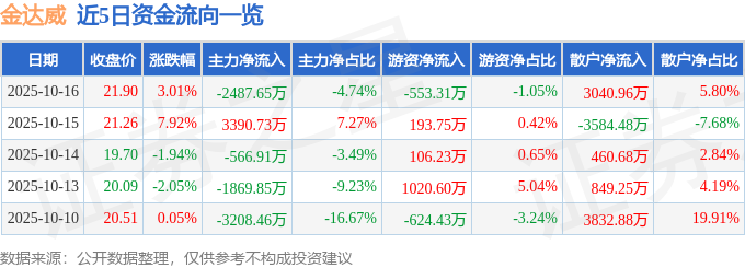证券之星消息,截至2025年10月16日收盘,金达威(002626)报收于21.9元,上涨3.01%,换手率3.92%,成交量23.9万手,成交额5.25亿元。