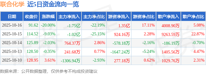 证券之星消息,截至2025年10月16日收盘,联合化学(301209)报收于91.62元,下跌20.0%,换手率15.4%,成交量8.37万手,成交额7.89亿元。