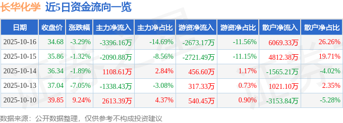 证券之星消息,截至2025年10月16日收盘,长华化学(301518)报收于34.68元,下跌3.29%,换手率12.35%,成交量6.6万手,成交额2.31亿元。