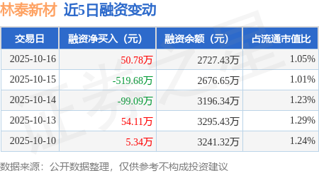 证券之星消息,10月16日,林泰新材(920106)融资买入126.35万元,融资偿还75.57万元,融资净买入50.78万元,融资余额2727.43万元。