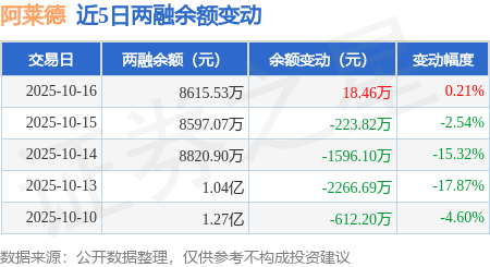 证券之星消息,10月16日,阿莱德(301419)融资买入379.8万元,融资偿还361.34万元,融资净买入18.46万元,融资余额8615.53万元,近20个交易日中有11个交易日出现融资净买入。