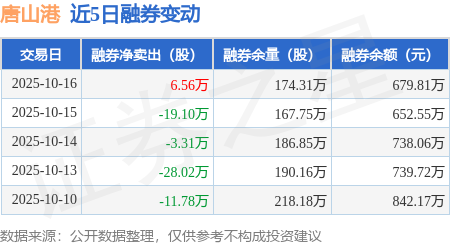 证券之星消息,10月16日,唐山港(601000)融资买入993.5万元,融资偿还975.43万元,融资净买入18.07万元,融资余额1.68亿元,近20个交易日中有13个交易日出现融资净买入。