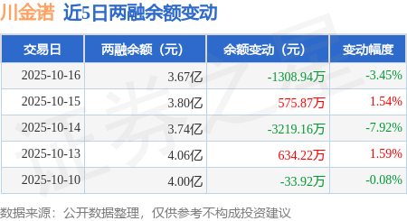 证券之星消息,10月16日,川金诺(300505)融资买入4832.06万元,融资偿还6141.01万元,融资净卖出1308.94万元,融资余额3.67亿元。