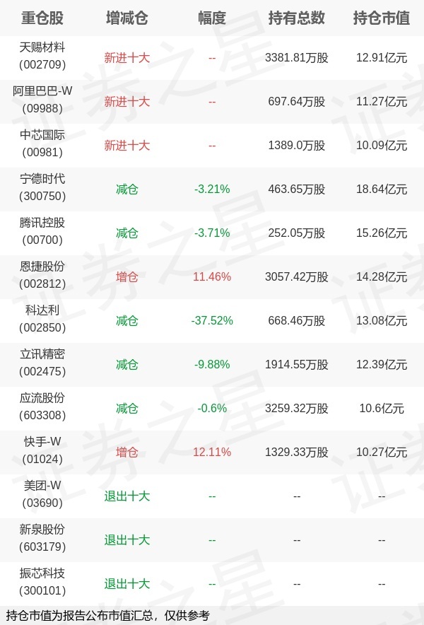 证券之星消息,10月17日泉果基金旗下赵诣管理的泉果旭源三年持有期混合型基金公布三季报,近1年净值增长率45.51%。与上一季度相比,该基金前十大重仓股新增天赐材料,阿里巴巴-W,中芯国际;其中宁德时代持仓占比9.77%,为该基金第一大重仓股;美团-W,新泉股份,振芯科技等退出前十大重仓股;详细数据如下: