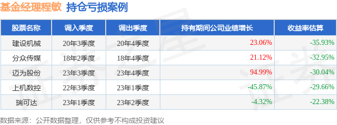 程敏管理的北信瑞丰研究精选基金在20年3季度买入建设机械,在持有1个季度后在20年4季度卖出。持有期间的估算收益率为-35.93%,持有期间建设机械在2019年到2020年的年报营业总收入增幅达23.06%。