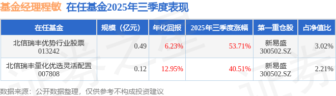 证券之星消息,截止2025年三季度末,基金经理程敏旗下共管理2只基金,本季度表现最佳的为北信瑞丰优势行业股票(013242),季度净值涨53.71%。