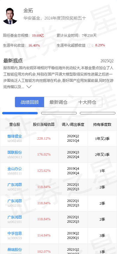 赛意信息(300687)是基金经理金拓的重仓股。,其在整个职业生涯内年化收益高达16.4%。金拓的大佬持仓 - 战绩回顾截图如下: