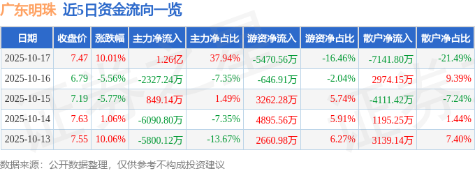 证券之星消息,截至2025年10月17日收盘,广东明珠(600382)报收于7.47元,上涨10.01%,涨停,换手率6.6%,成交量45.8万手,成交额3.32亿元。
