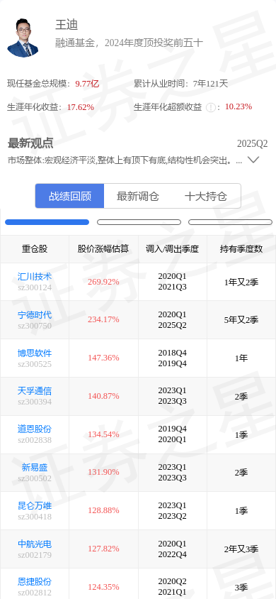 中天科技(600522)是基金经理王迪的重仓股。,其在整个职业生涯内年化收益高达17.62%。王迪的大佬持仓 - 战绩回顾截图如下: