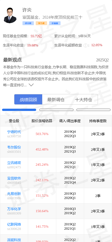 瑞芯微(603893)是基金大佬许炎的重仓股。,其在整个职业生涯内年化收益高达19.68%。许炎的大佬持仓 - 战绩回顾截图如下:
