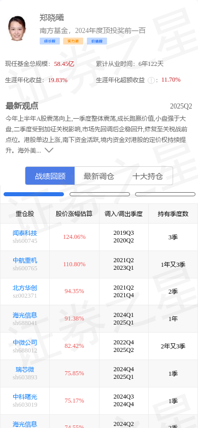 万业企业(600641)是基金经理郑晓曦的重仓股。,其在整个职业生涯内年化收益高达19.83%。郑晓曦的大佬持仓 - 战绩回顾截图如下: