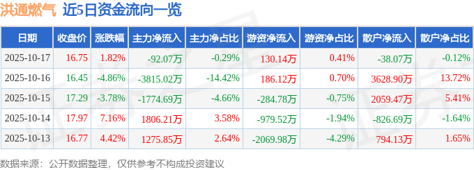 证券之星消息,截至2025年10月17日收盘,洪通燃气(605169)报收于16.75元,上涨1.82%,换手率6.72%,成交量19.01万手,成交额3.2亿元。