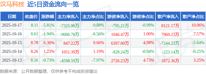 证券之星消息,截至2025年10月17日收盘,汉马科技(600375)报收于8.11元,下跌5.81%,换手率8.88%,成交量96.54万手,成交额8.07亿元。