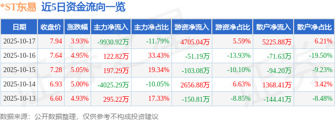 证券之星消息,截至2025年10月17日收盘,*ST东易(002713)报收于7.94元,上涨3.93%,换手率26.17%,成交量107.67万手,成交额8.42亿元。