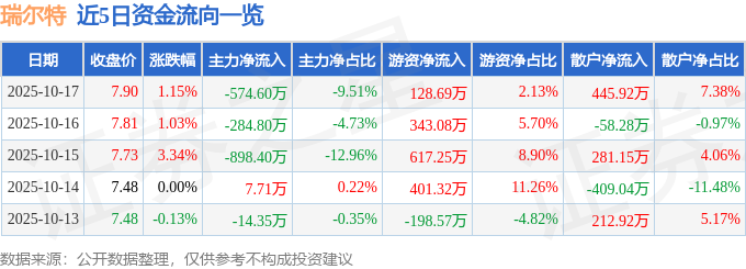 证券之星消息,截至2025年10月17日收盘,瑞尔特(002790)报收于7.9元,上涨1.15%,换手率2.94%,成交量7.68万手,成交额6041.42万元。