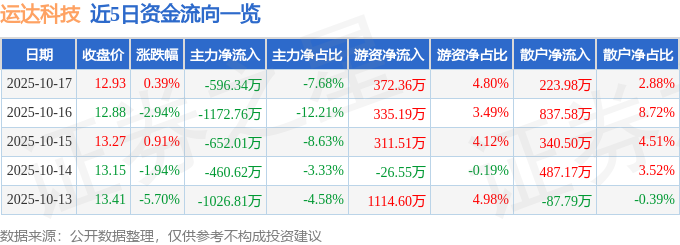 证券之星消息,截至2025年10月17日收盘,运达科技(300440)报收于12.93元,上涨0.39%,换手率1.35%,成交量5.99万手,成交额7764.83万元。