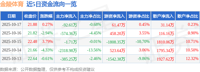 证券之星消息,截至2025年10月17日收盘,金陵体育(300651)报收于21.88元,上涨0.27%,换手率7.03%,成交量6.15万手,成交额1.36亿元。