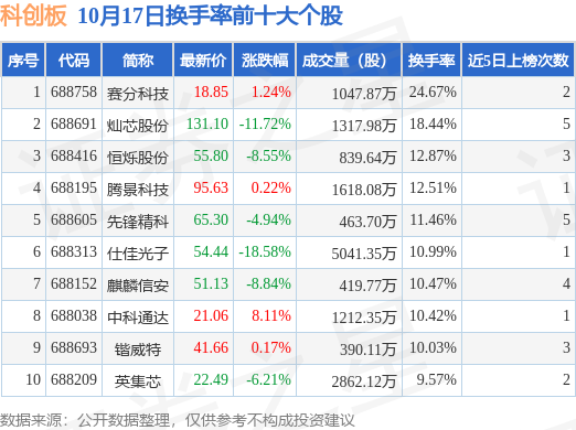 当日科创板换手率前10大个股中4只个股收涨,平均涨幅2.44%,其中赛分科技(688758)以换手率24.67%排第一,7只个股近5个交易日中多次上榜。