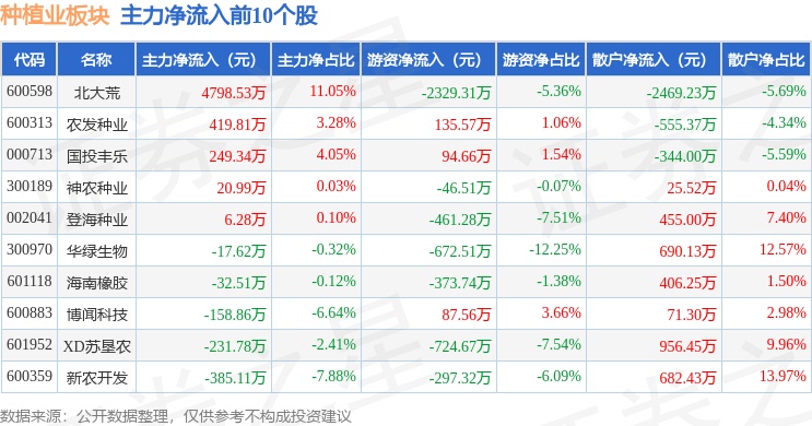 从资金流向上来看,当日种植业板块主力资金净流出1.82亿元,游资资金净流入1985.65万元,散户资金净流入1.62亿元。种植业板块个股资金流向见下表: