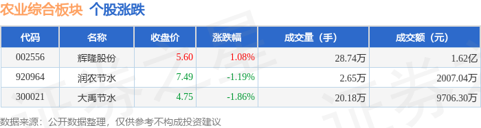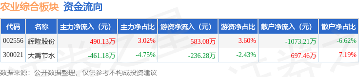 从资金流向上来看,当日农业综合板块主力资金净流入28.95万元,游资资金净流入346.8万元,散户资金净流出375.75万元。农业综合板块个股资金流向见下表: