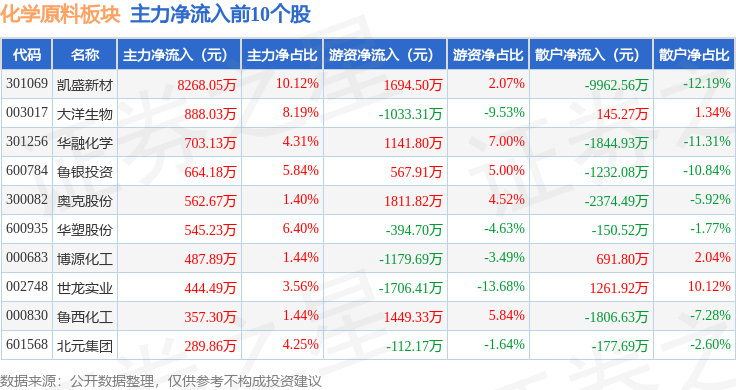 从资金流向上来看,当日化学原料板块主力资金净流出6.78亿元,游资资金净流入2.73亿元,散户资金净流入4.05亿元。化学原料板块个股资金流向见下表: