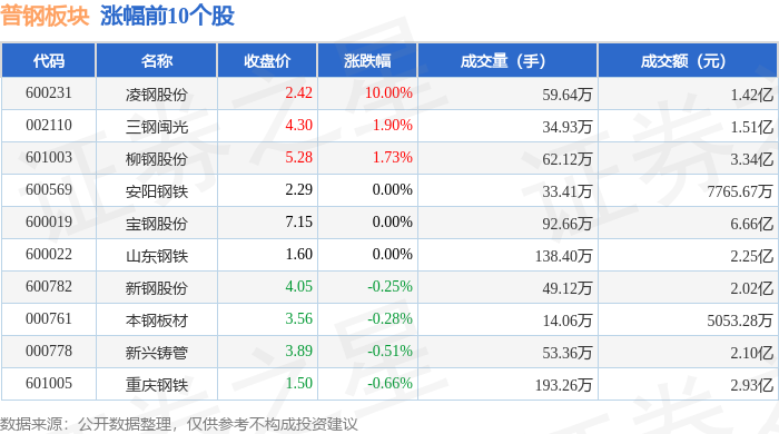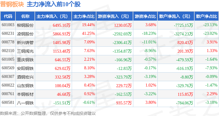 从资金流向上来看,当日普钢板块主力资金净流出3.37亿元,游资资金净流入9300.09万元,散户资金净流入2.44亿元。普钢板块个股资金流向见下表: