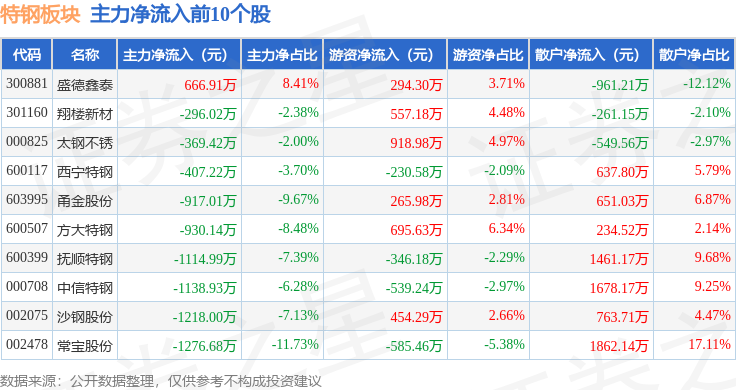 从资金流向上来看,当日特钢板块主力资金净流出1.53亿元,游资资金净流入3495.12万元,散户资金净流入1.18亿元。特钢板块个股资金流向见下表: