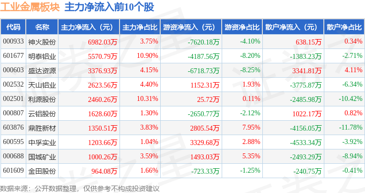 从资金流向上来看,当日工业金属板块主力资金净流出33.98亿元,游资资金净流入6.29亿元,散户资金净流入27.69亿元。工业金属板块个股资金流向见下表: