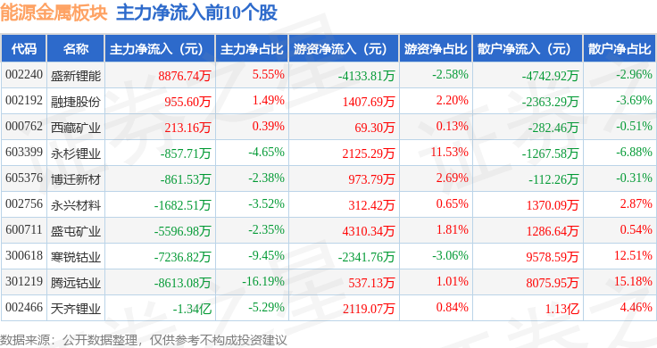 从资金流向上来看,当日能源金属板块主力资金净流出21.5亿元,游资资金净流入3.64亿元,散户资金净流入17.87亿元。能源金属板块个股资金流向见下表: