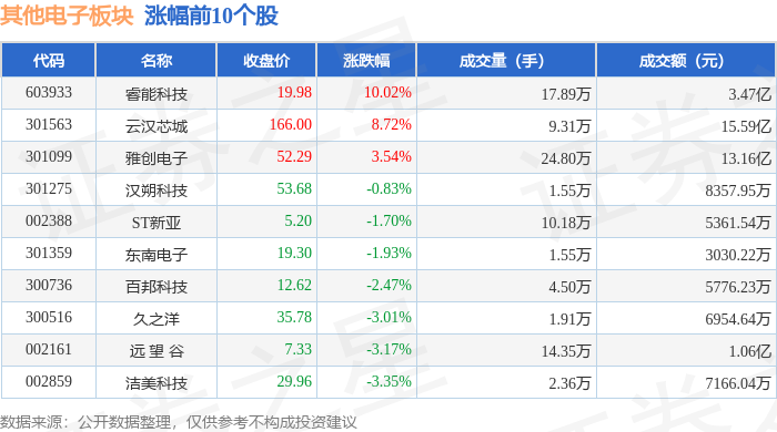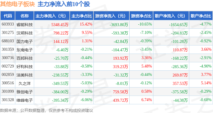 从资金流向上来看,当日其他电子板块主力资金净流出14.25亿元,游资资金净流入2.21亿元,散户资金净流入12.05亿元。其他电子板块个股资金流向见下表: