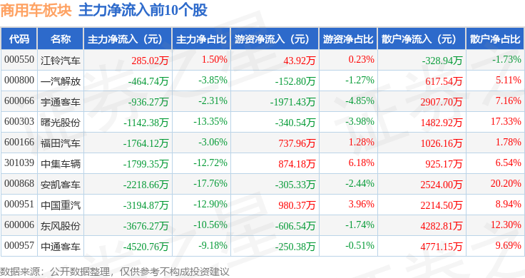 从资金流向上来看,当日商用车板块主力资金净流出8.7亿元,游资资金净流入1.73亿元,散户资金净流入6.97亿元。商用车板块个股资金流向见下表: