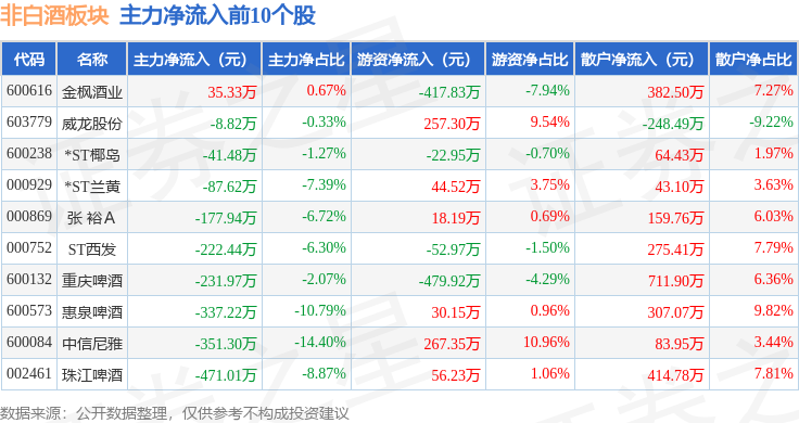 从资金流向上来看,当日非白酒板块主力资金净流出1.63亿元,游资资金净流出1141.67万元,散户资金净流入1.74亿元。非白酒板块个股资金流向见下表:
