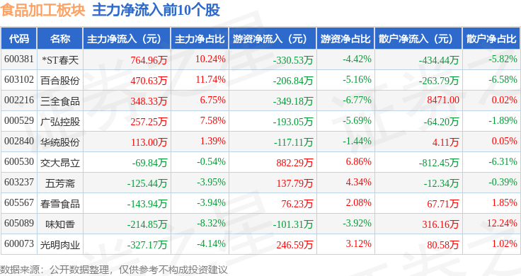 从资金流向上来看,当日食品加工板块主力资金净流出2.36亿元,游资资金净流入1333.64万元,散户资金净流入2.22亿元。食品加工板块个股资金流向见下表: