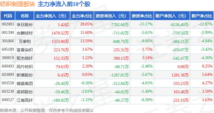 从资金流向上来看,当日纺织制造板块主力资金净流出4942.39万元,游资资金净流出8597.74万元,散户资金净流入1.35亿元。纺织制造板块个股资金流向见下表: