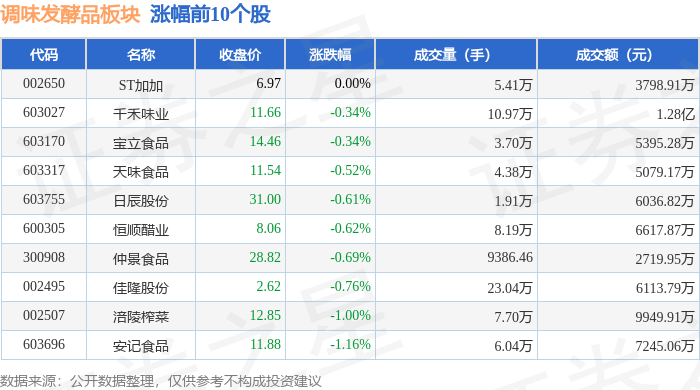 证券之星消息,10月17日调味发酵品板块较上一交易日下跌1.55%,安琪酵母领跌。当日上证指数报收于3839.76,下跌1.95%。深证成指报收于12688.94,下跌3.04%。调味发酵品板块个股涨跌见下表: