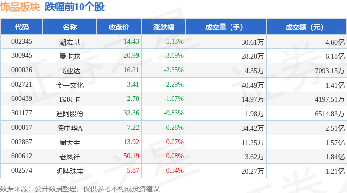 从资金流向上来看,当日饰品板块主力资金净流入471.13万元,游资资金净流出2854.78万元,散户资金净流入2383.65万元。饰品板块个股资金流向见下表: