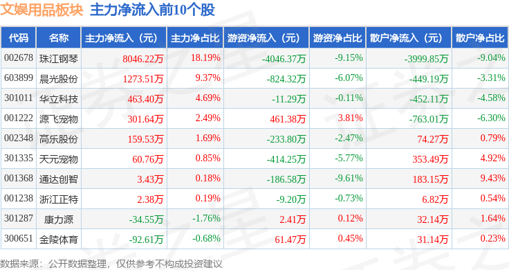 从资金流向上来看,当日文娱用品板块主力资金净流入553.04万元,游资资金净流出5431.65万元,散户资金净流入4878.62万元。文娱用品板块个股资金流向见下表:
