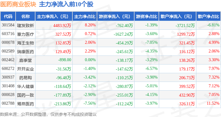 从资金流向上来看,当日医药商业板块主力资金净流出2.46亿元,游资资金净流入2633.03万元,散户资金净流入2.2亿元。医药商业板块个股资金流向见下表: