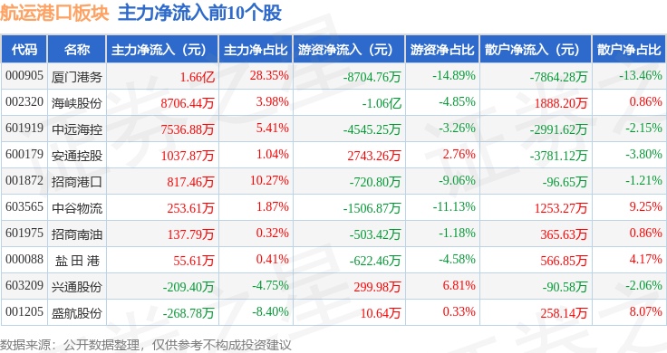 从资金流向上来看,当日航运港口板块主力资金净流出2.36亿元,游资资金净流出2.8亿元,散户资金净流入5.16亿元。航运港口板块个股资金流向见下表: