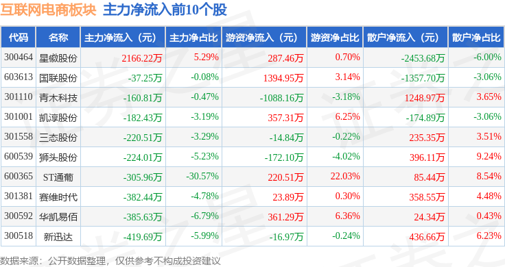从资金流向上来看,当日互联网电商板块主力资金净流出1.23亿元,游资资金净流出100.47万元,散户资金净流入1.24亿元。互联网电商板块个股资金流向见下表: