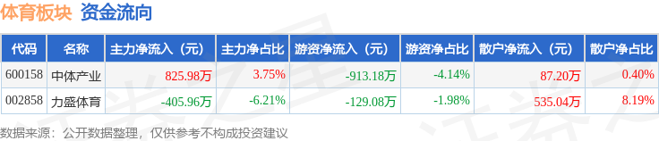 从资金流向上来看,当日体育板块主力资金净流入420.02万元,游资资金净流出1042.26万元,散户资金净流入622.24万元。体育板块个股资金流向见下表: