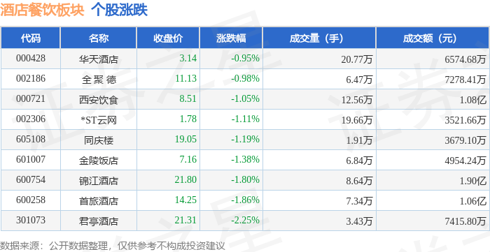 证券之星消息,10月17日酒店餐饮板块较上一交易日下跌1.63%,君亭酒店领跌。当日上证指数报收于3839.76,下跌1.95%。深证成指报收于12688.94,下跌3.04%。酒店餐饮板块个股涨跌见下表: