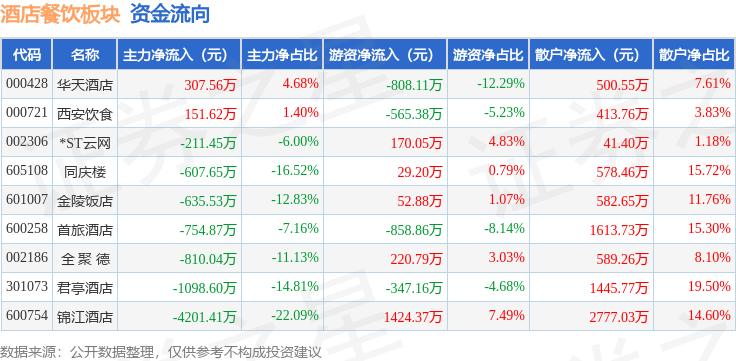 从资金流向上来看,当日酒店餐饮板块主力资金净流出7860.37万元,游资资金净流出682.24万元,散户资金净流入8542.61万元。酒店餐饮板块个股资金流向见下表:
