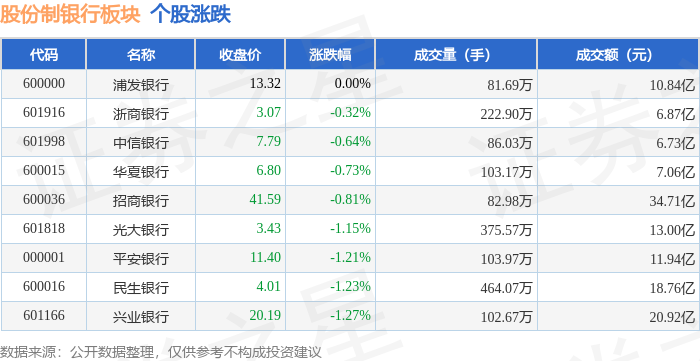 证券之星消息,10月17日股份制银行板块较上一交易日下跌0.8%,兴业银行领跌。当日上证指数报收于3839.76,下跌1.95%。深证成指报收于12688.94,下跌3.04%。股份制银行板块个股涨跌见下表: