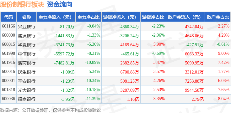 从资金流向上来看,当日股份制银行板块主力资金净流出9.35亿元,游资资金净流入2.49亿元,散户资金净流入6.85亿元。股份制银行板块个股资金流向见下表: