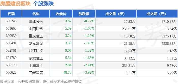 证券之星消息,10月17日房屋建设板块较上一交易日下跌1.29%,高新发展领跌。当日上证指数报收于3839.76,下跌1.95%。深证成指报收于12688.94,下跌3.04%。房屋建设板块个股涨跌见下表: