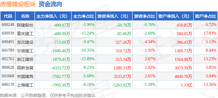 从资金流向上来看,当日房屋建设板块主力资金净流出2.51亿元,游资资金净流入366.96万元,散户资金净流入2.47亿元。房屋建设板块个股资金流向见下表: