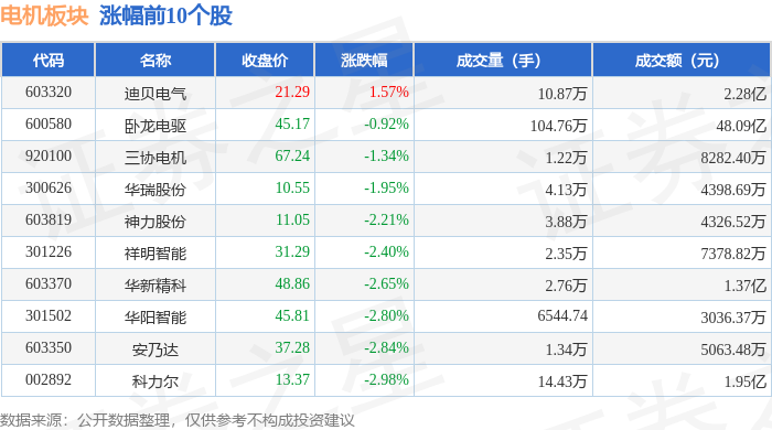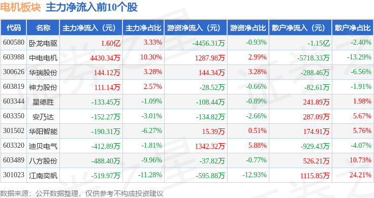 从资金流向上来看,当日电机板块主力资金净流出5.75亿元,游资资金净流入8737.85万元,散户资金净流入4.88亿元。电机板块个股资金流向见下表: