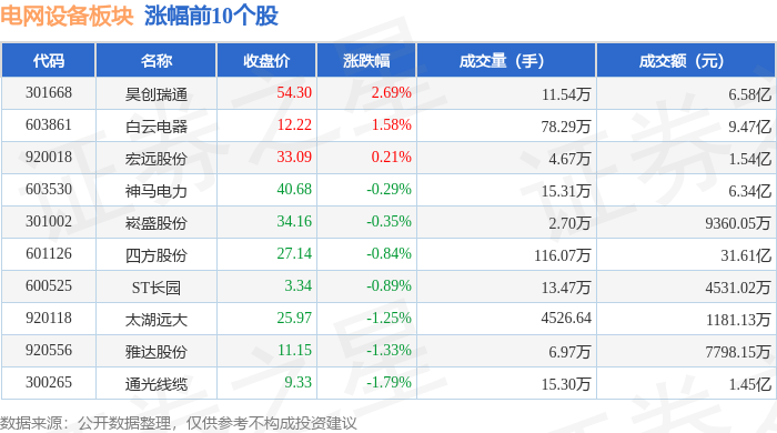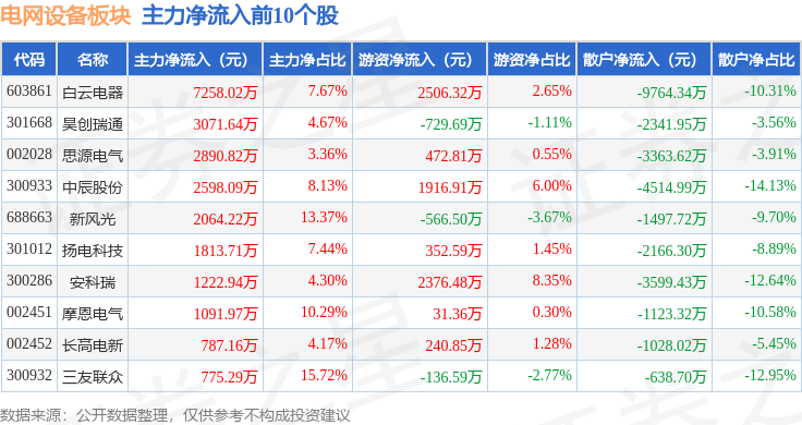 从资金流向上来看,当日电网设备板块主力资金净流出51.97亿元,游资资金净流入12.14亿元,散户资金净流入39.83亿元。电网设备板块个股资金流向见下表: